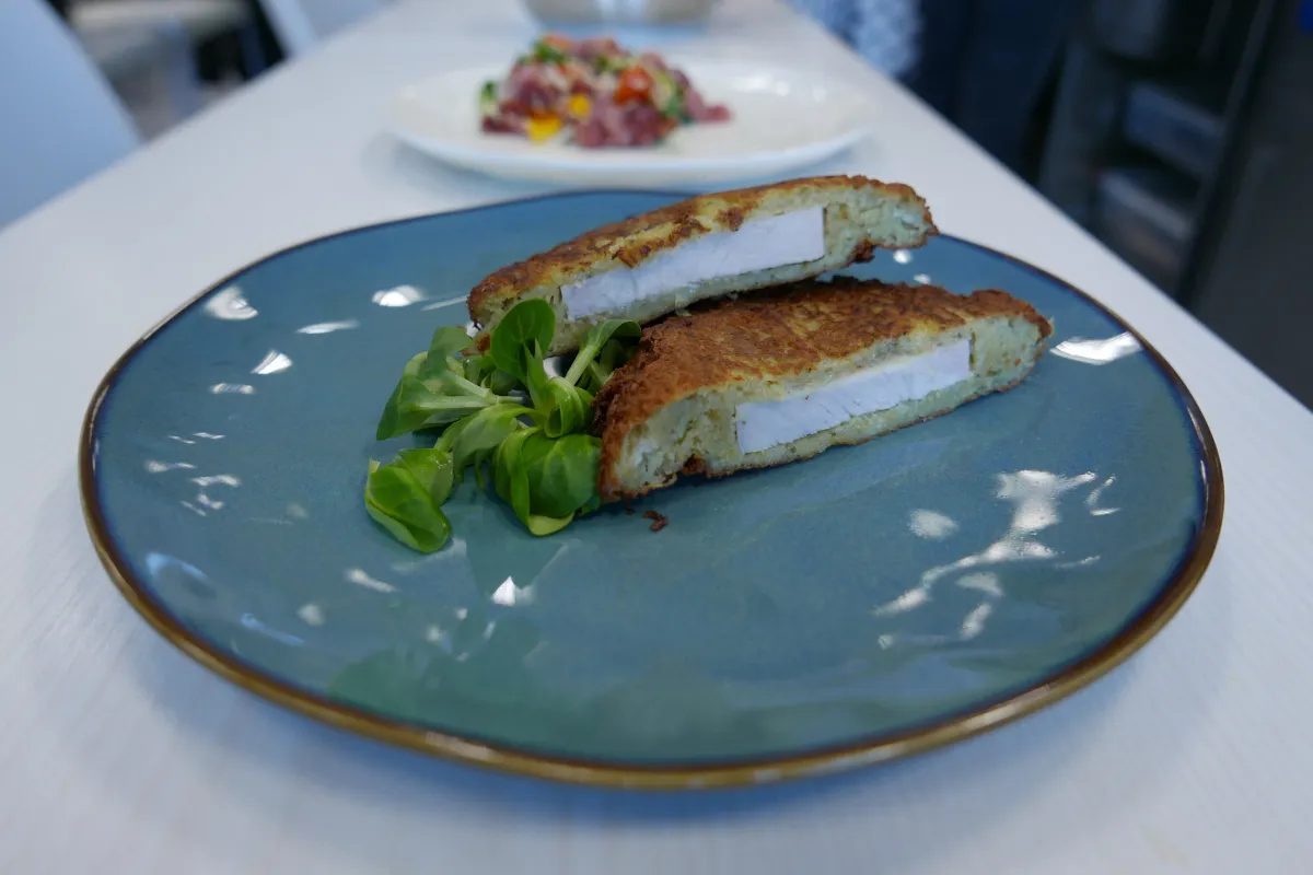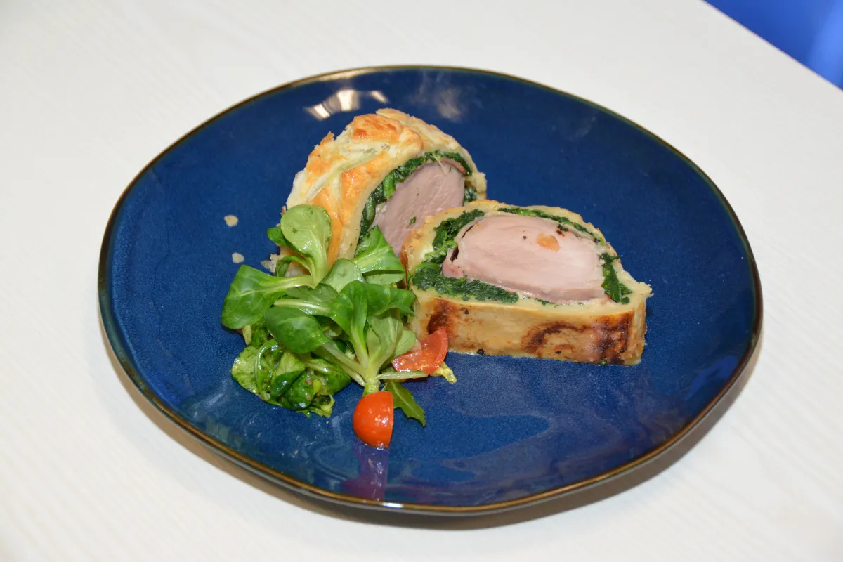 (pečeně sous-vide zapečená v bramborákovém těstě) - Krůtí roláda se salátem