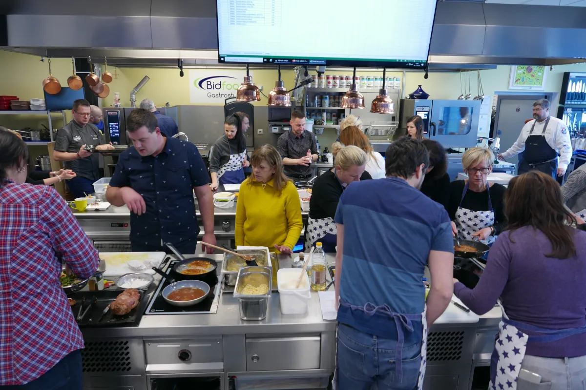 Bidfood neustále vzdělává své obchodní zástupce. Tentokrát si po teoretické části všichni vlastnoručně vyzkoušeli, jak se pracuje s masem sous-vide Banquet. Každý pětičlenný tým měl za úkol připravit během 60 minut čtyři pokrmy: