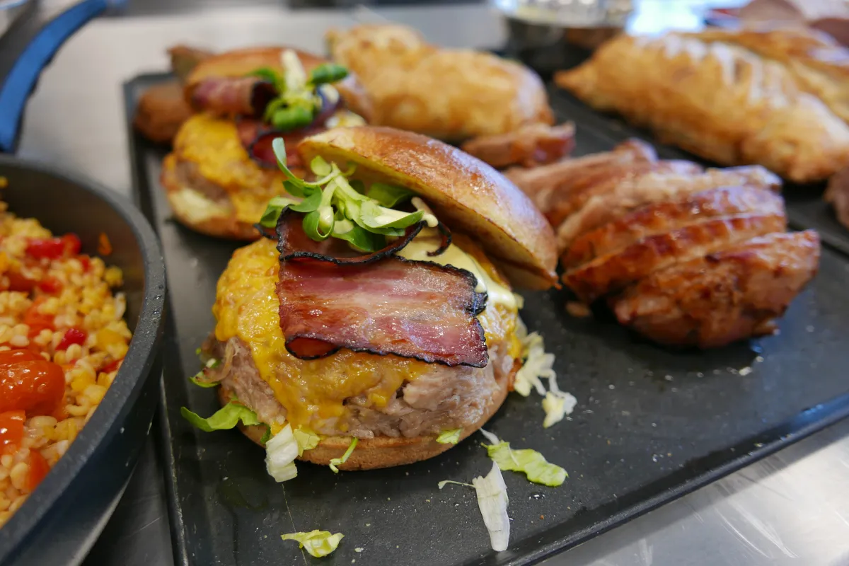 (pepitky, bulgur, mungo klíčky, cherry rajčata, paprika) - Burger s trhaným vepřovým masem,