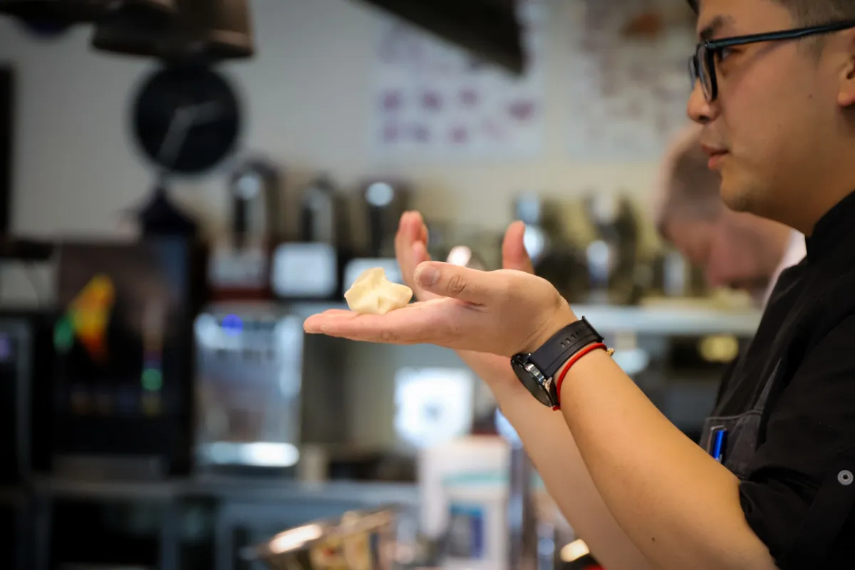 Následovaly dim sum knedlíčky připravované ve dvou variantách: dušené v páře a fritované. Baoyong ukázal rozdíly nejen ve výsledné chuti, ale také v přípravě a prezentaci. Práce s těstem, plněním i pečlivým skládáním ukázala, že právě v jednoduchosti se často skrývá skutečné mistrovství.