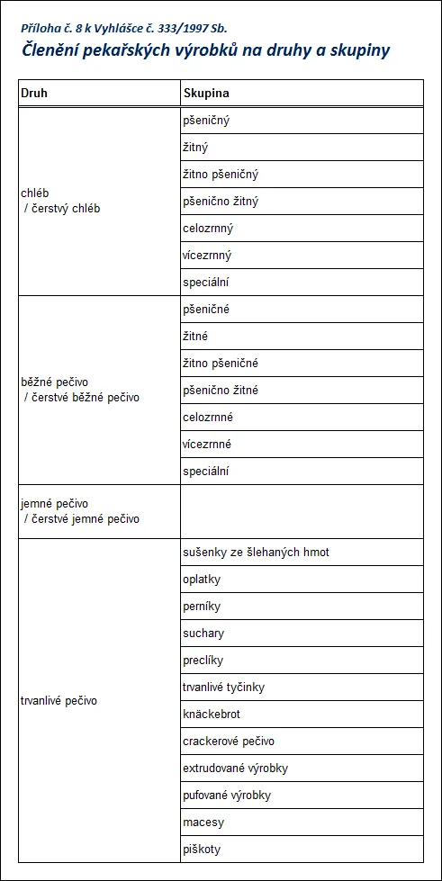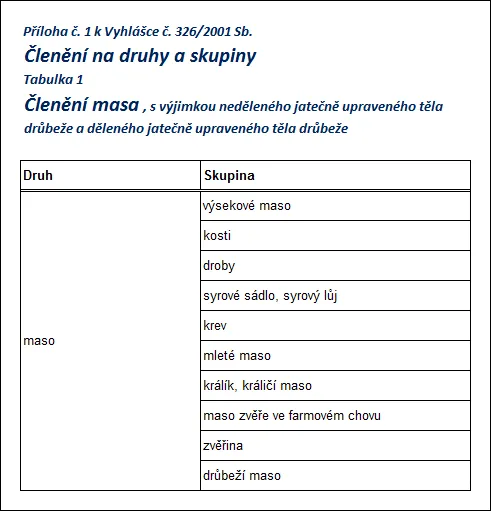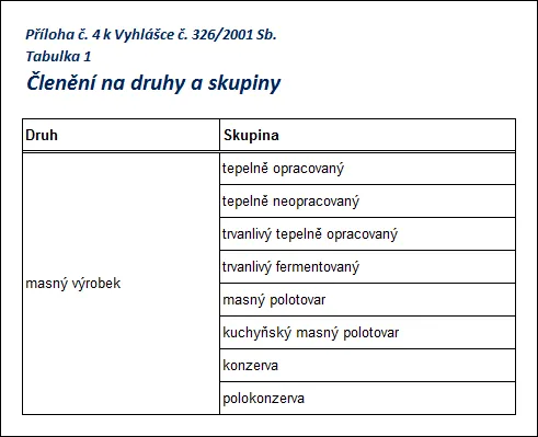 - Název potraviny a legislativní zatřídění dle komoditních vyhlášek. Konkrétní zatřídění viz níže.