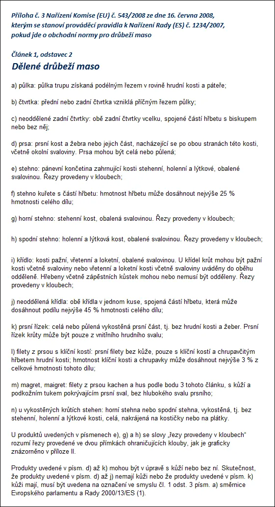 Druhy a části drůbežího masa, třídy jakosti a způsoby značení (s kostí, kůží, bez kosti, bez kůže) jsou popsány v Nařízení č. 543/2008 (viz níže Příloha č. 3).