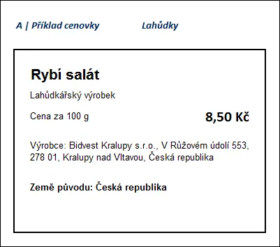 Následující informace je třeba umístit u cenovky a/nebo na chladící pult. Například část údajů na cenovku a společné údaje pro více výrobků na pult.
