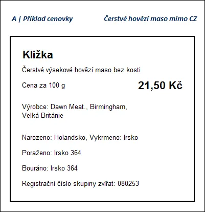 - Země původu u hovězího masa: "Narozeno:" a "Vykrmeno:" V případě stejné země lze uvést zemi za "Původ:" Dále se u hovězího masa uvádí země a veterinární číslo k "Poraženo:" a "Bouráno:"