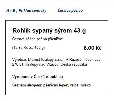 - Název a adresa výrobce. Musí být uvedena úplná adresa výrobce (pokud není uveden, pak dodavatele) podle etikety nebo dodacího listu, tj. název firmy, ulice, čp., PSČ, město a stát. Pokud jste výrobce, uvedete adresu podle obchodního rejstříku nebo živnostenského listu (výrobce jste i v případě dopečení pečiva) a raději i konkrétní provozovnu.