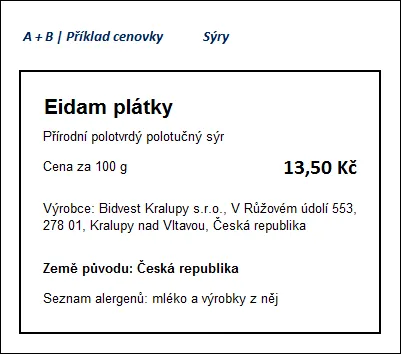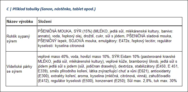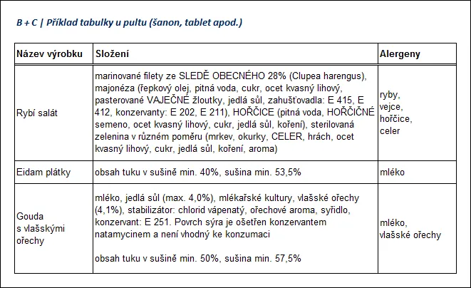 Způsob zpracování údajů je dobrovolný. U složení výrobku doporučujeme zvýraznit alergeny a zpracovat přehled jednotlivých výrobků ve formě tabulky. Složení lze uvést také na cenovce – spojit povinnosti A + C, ale to vždy není praktické řešení.