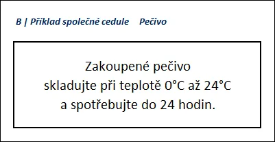 - Teplota skladování. Hodnoty uvedené v příkladech jsou u masa a ryb legislativou stanovené spodní a horní meze skladování. Jinde jde o příklady a hodnoty musí být odvozeny z teplot skladování uvedených výrobcem.