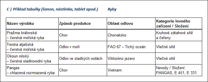 - Údaje k čerstvému masu a rybám podle platné legislativy. Požadované údaje viz níže "Maso" respektive "Ryby".