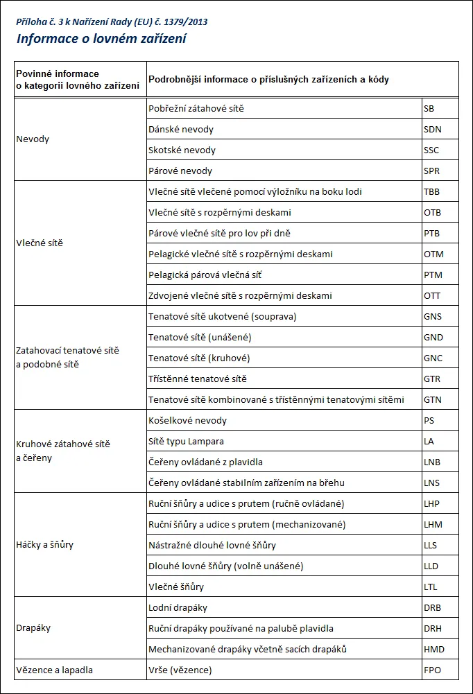 Rybolovná technika se uvádí v blízkosti místa nabízení k prodeji (informace o lovném zařízení viz níže Příloha č. 3 Nařízení EU č. 1379/2013).