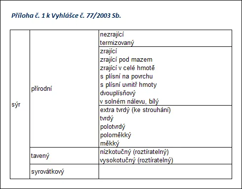 Požadavky pro označování mléka a mléčných výrobků stanovuje mimo jiné také vyhláška č. 77/2003 Sb. (legislativní roztřídění viz níže Příloha č. 1). Povinnosti vyhlášky se vztahují pouze na české výrobce, proto podle ní nejsou označeny výrobky ze zahraničí. Dále se sýry mohou označit podle konzistence, tučnosti nebo zrání (viz níže tabulky č. 9, 10 a 12).