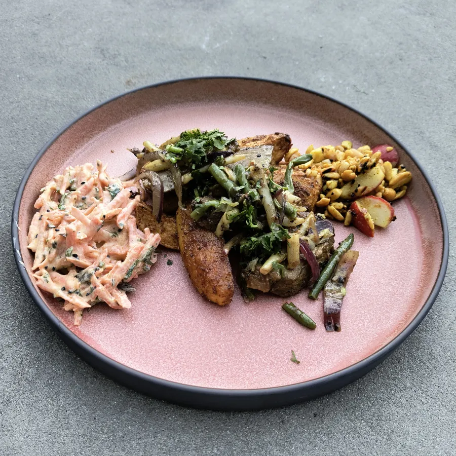 V menu byly zastoupené i dva lehké saláty – carrot pachadi a radish salad. Základem prvního zmíněného je mrkev ochucená černými hořčičnými semínky, sušeným chilli, kari a koriandrovými lístky. To vše je spojené osvěžujícím jogurtem. Radish salad je kombinací ředkviček a orestovaných arašídů. Oba dva saláty jsou skvělou přílohou k pečenému či grilovanému masu. Ovšem mohou se servírovat i samostatně.