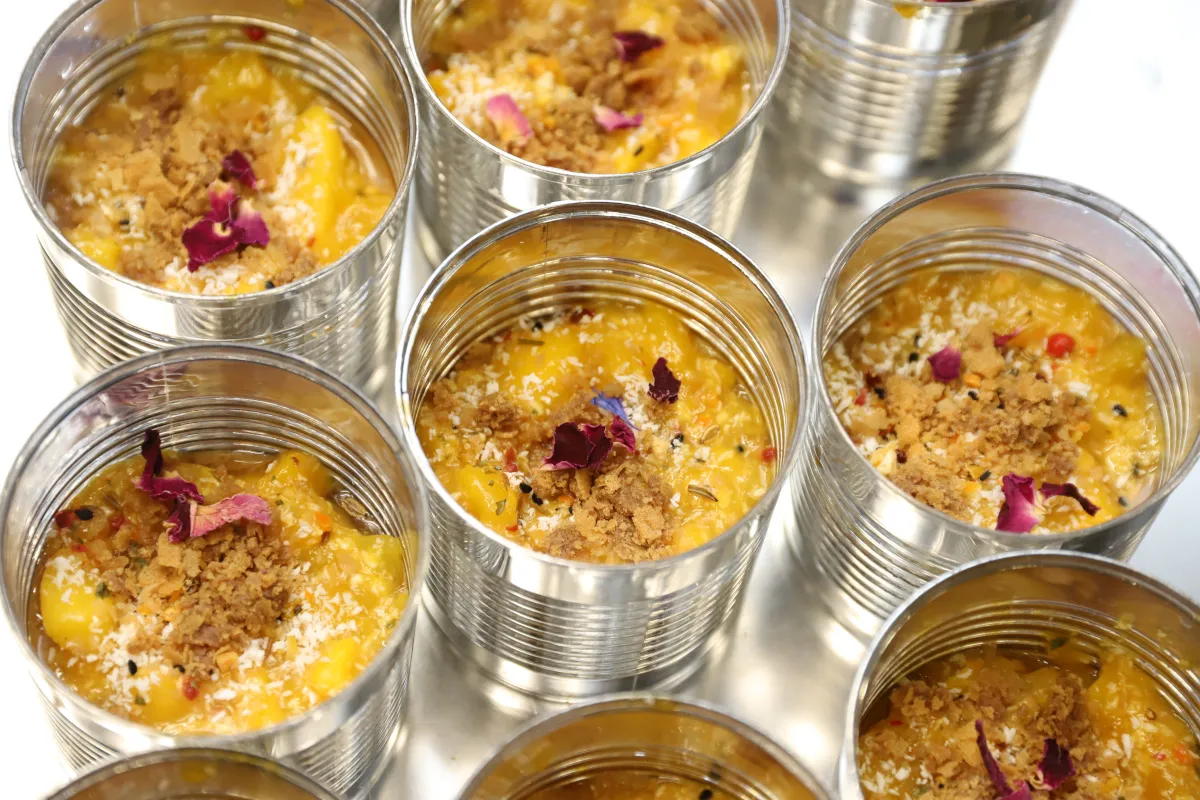 Obvyklé indické dezerty by nikoho u nás nenadchly. „S ohledem na horké podnebí se tam nepoužívá smetana ani žádné krémy. Základem je vždy nějaké těsto a opravdu hodně cukru, aby zákusky vydržely,“ uvádí šéfkuchař Marek Svoboda, který workshop uzavřel sladkou tečkou v podobě karamelového pudinku s kokosem a mangem, který byl ukázkovým příkladem fusion kuchyně. Kombinoval v sobě tradiční chutě i místní suroviny, tedy čerstvé šťavnaté ovoce a lehce pikantní koření, s klasickým evropským základem. Spojení zafungovalo výtečně. Pudink nejen úchvatně vypadal, ale i fantasticky chutnal.