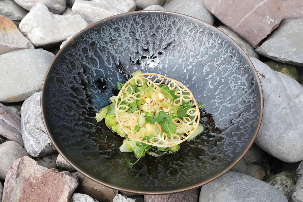 Úsporný styl byl patrný už v předkrmu, kdy z kedluben nezůstalo naprosto nic. Dužinu René namarinoval a z listů, které by většina ostatních vyhodila, připravil skvělý olej. „Do jeho základu stačí dát obyčejný olej. Olivový nepoužívám ze tří důvodů. Je drahý, jeho aroma by přebilo kedlubnu a také při mixování ho zahříváme,“ poznamenal René Tichý.