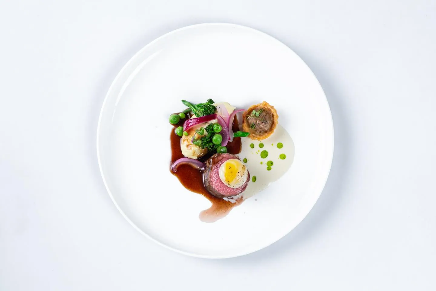 Hlavní chod Čížkova tříchodového soutěžního menu představoval telecí ořech v úpravě sous-vide, doplněný o masový quiche, křepelčí žloutek a zauzené bramborové pyré s glazurovanou sezónní zeleninou. Výsledná chuť byla podtržena silnou základní omáčku – telecí jus – a koprovou pěnou.