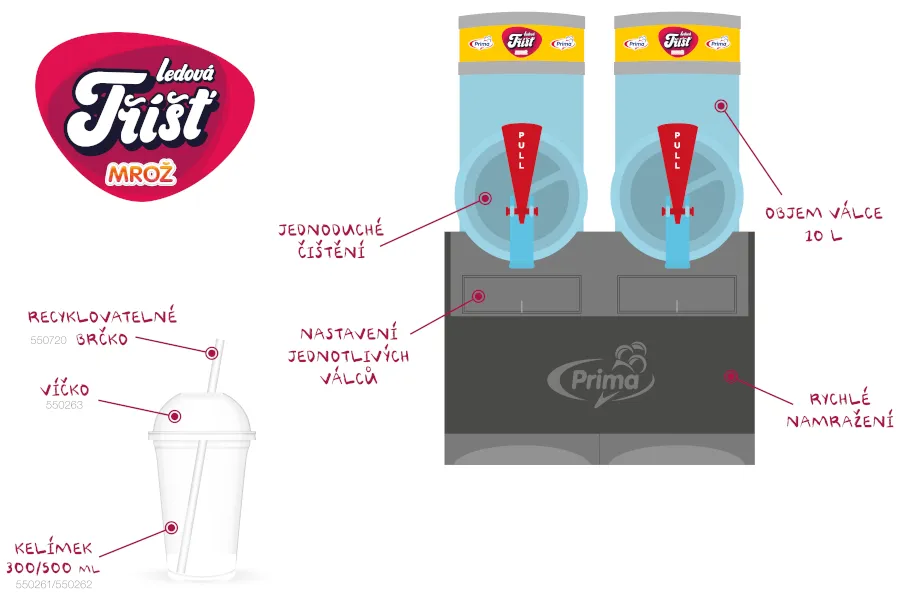 Nejmenší jistě potěší populární modrá ledová tříšť šmoula a starší nepostradatelná cola. K tradičním příchutím patří jahoda či šťavnaté zelené jablko. Luxusnější pomerančová ledová tříšť vznikla v exkluzivní spolupráci Prima zmrzliny s jabloneckou firmou Kitl, která nejen v Jizerských horách proslula výrobou ovocných a bylinných sirupů.