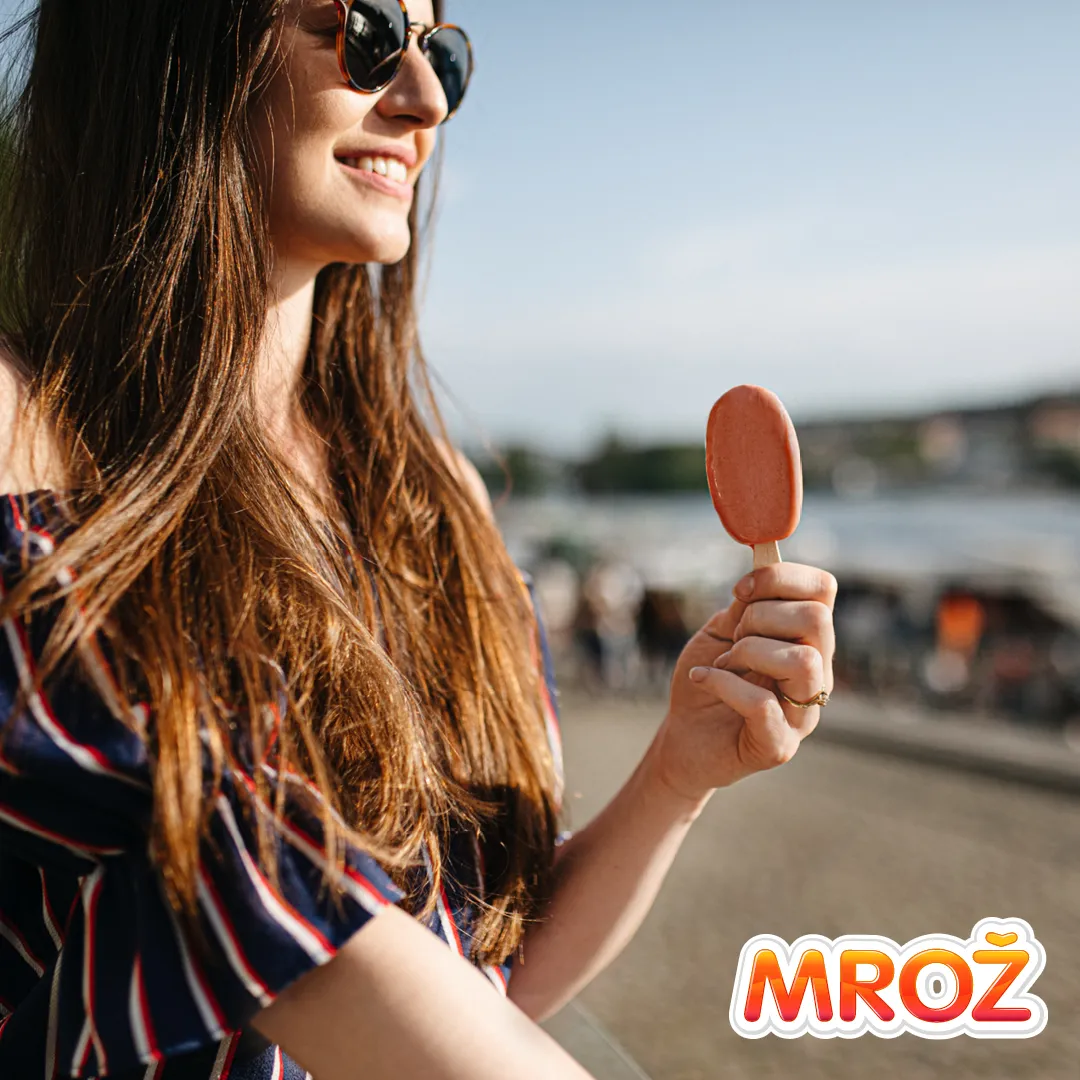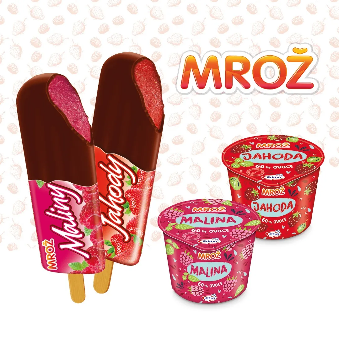 Ovocné zmrzliny Mrož Jahody a Mrož Maliny obsahují jen 4 ingredience: 60 % nepasírovaného ovoce, cukr, vodu a štipec kyseliny citronové (žádné stabilizátory). Obě zmrzliny jsou na dřívku a zalité kakaovou polevou.