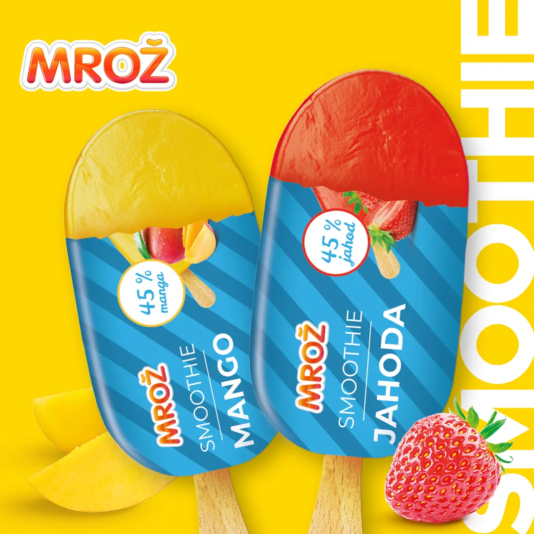 Mrazivě dobré a vysoce kvalitní novinky Mrož smoothie skvěle osvěží v horkých dnech. Jemná jahodová i mangová zmrzlina mají jedinečný 45% podíl ovoce.