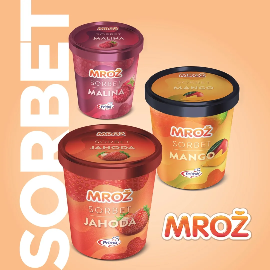 Sorbety na rozdíl od zmrzlin neobsahují tuk ani laktózu. Jsou ideální pochoutkou po hlavním jídle. V pintových kelímcích se úspěšně zabydlela trojice loňských novinek – Mrož sorbety mango, jahoda a malina.