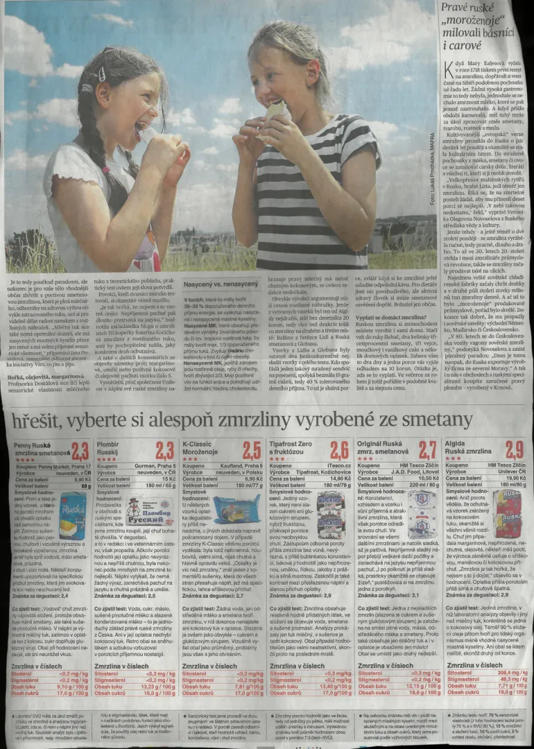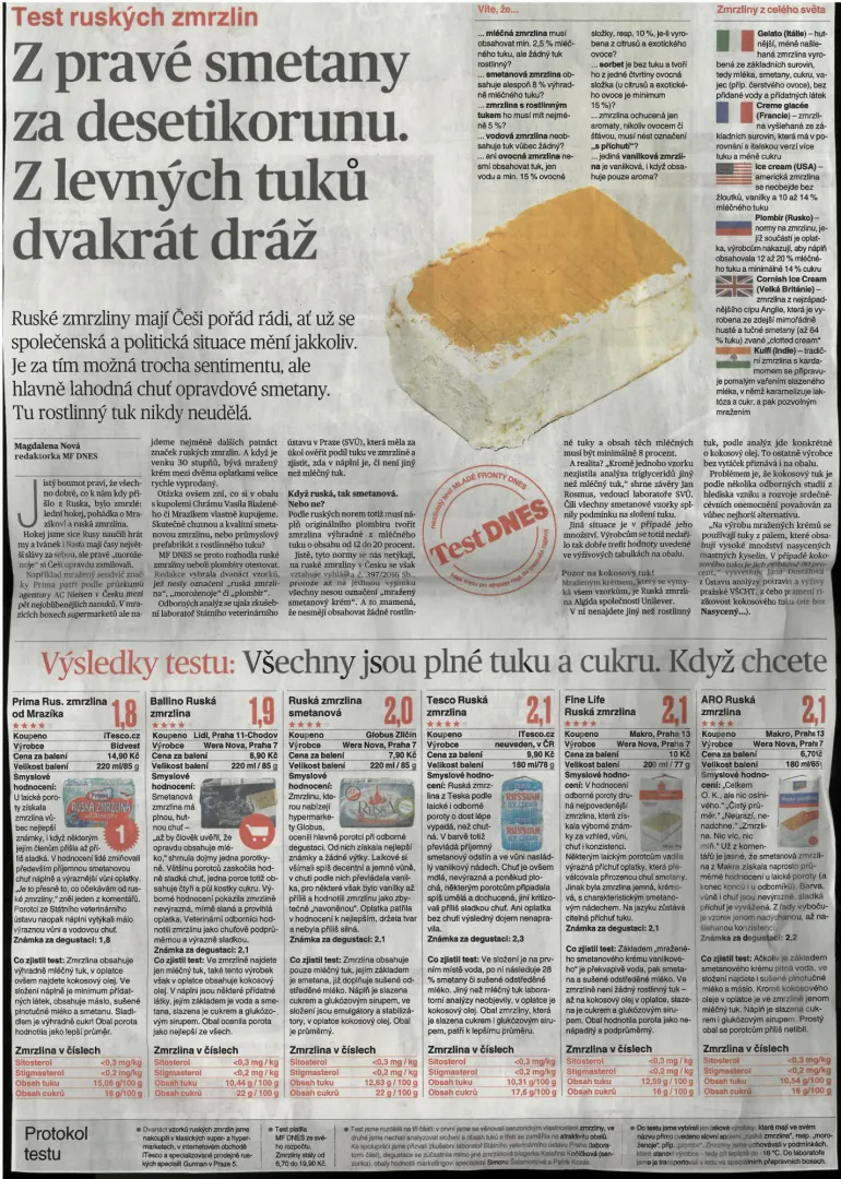 Redakce MF Dnes se rozhodla otestovat smetanové zmrzliny mezi dvěma oplatkami. Zakoupila v obchodech dvanáct vzorků s označením ruská zmrzlina, moroženoje či plombir. Vítězem se stala Prima nejen díky příjemné smetanové chuti zmrzliny a vůni oplatky.